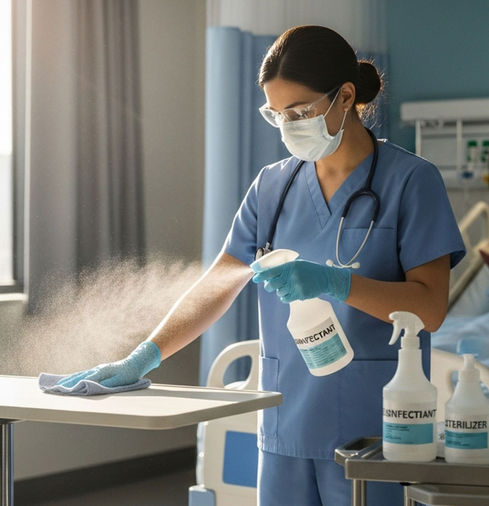 очистку и дезинфекцию мебели, медицинского оборудования и рабочих поверхностей